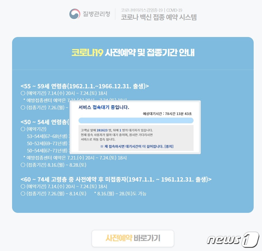 사전점검까지 했지만, 세 번째 시스템 오류 사태가 벌어지면서 정부에 대한 불신이 커지고 있습니다. (토) 18시 * 예방접종센터 예약은 7.21. 한 커뮤니티 이용자는 서버 오픈 30분 전 '부모님이 맞으실 백신 예약을 마쳤다'는 인증 글을 올리며 우회 주소 링크를 첨부했다. 지난 19일 코로나19 백신 사전예약이 53~54세를 대상으로 진행됐지만 접속이 지연되는 등 이용자들이 불편을 겪었다. 시스템 메인 페이지는 오후 8시 전까지 닫혀 있었으나 예약 페이지에 바로 접속하는 링크가 존재했던 것이다. 또 웹브라우저 크롬을 통해 백신 예약 사이트에 대기 없이 우회 접속하는 방법도 온라인상에서 공유됐다. 이런 과정 속에서 지친 일부 이용자들은 급기야 백신 사전 예약 사이트의 '뒷문'으로 들어가기 시작했다. 20일 코로나19 예방접종 대응 추진단 (추진단)은 백신 사전예약 먹통 사태와 관련 전날 오후 20시 만 53~54세 백신 사전예약 시작과 동시에 접속자가 많아질 것을 우려해 클라우드 서버 4개를 통해 대응하려 했지만 예상치보다 접속자가 많아 '교착상태'가 됐다. 15일 서울 동대문구 백신접종센터에서 백신 접종을 마친 시민들이 이상반응. 백신 접종 예약 페이지에 우회접속 할 수 있었던 상황은 이번이 처음이 아니다. 웹 · 모바일 모두 접속 가능하며, 총 2단계의 과정을 통하여 코로나19 예방접종 온라인 예약이 완료됩니다. 지난 19일 코로나19 백신 사전예약이 53~54세를 대상으로 진행됐지만 접속이 지연되는 등 이용자들이 불편을 겪었다. 코로나 백신 우회 예약 사이트 접속.